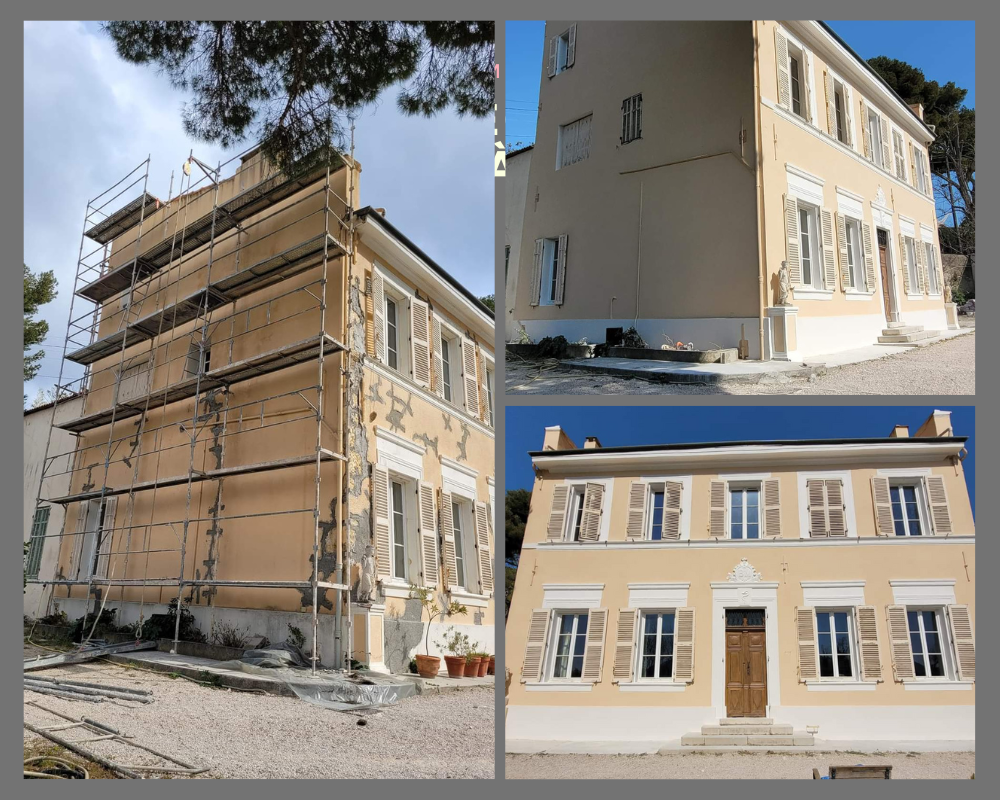 Grande façade rénovée grâce à l’enduit avec finition frotassé.